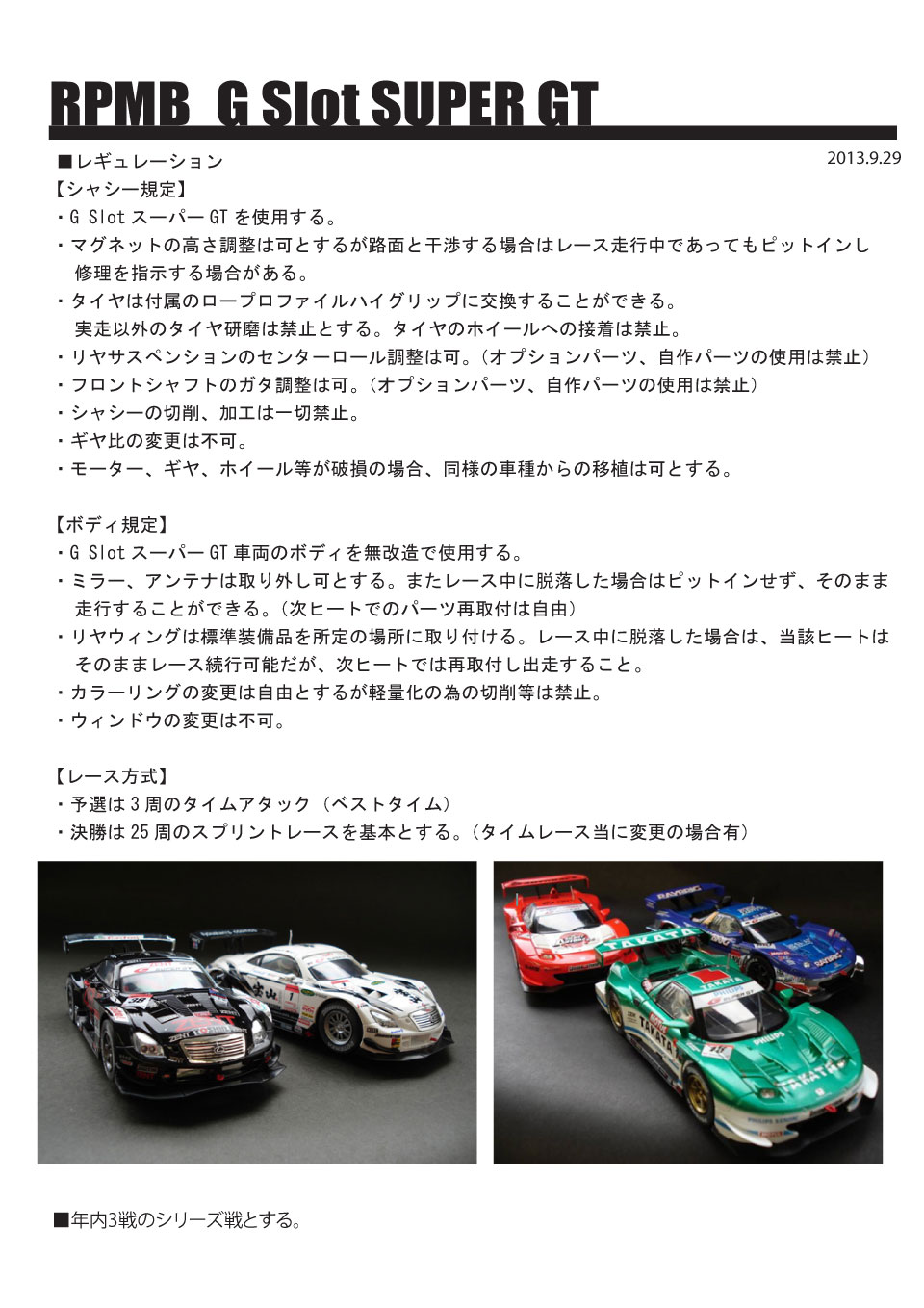 G SLOTスーパーGT車両を使用したレースです。レギュレーションはイコールコンデションになるよう最小限の調整のみとなっています。詳しくはスタッフブログ、店頭にてご確認ください。初心者の方からベテランさんまで楽しめるレースです。http://ameblo.jp/mizosha/entry-11626200407.html参加料:当日走行料金込(1500円~2000円)+500円